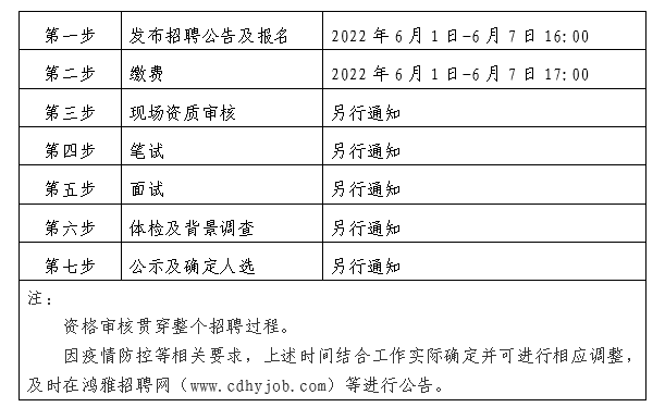 2022年6月1日至2022年6月7日16:00 在鴻雅招聘網(wǎng)(http://www.cdhyjob.com/)、鴻雅微信公眾號、國控集團(tuán)官方網(wǎng)站(http://www.mengxiangdownload.com/)及上級部門要求的相關(guān)網(wǎng)站等發(fā)布招聘公告。