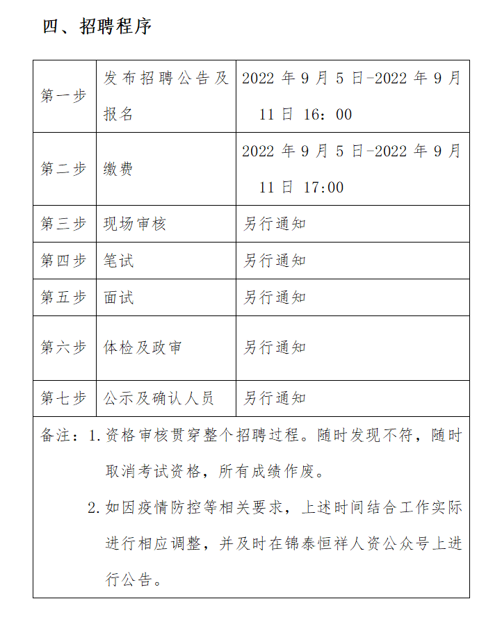 ? (二)體檢時間、地點及注意事項在“錦泰恒祥人資公眾號”進行通知。