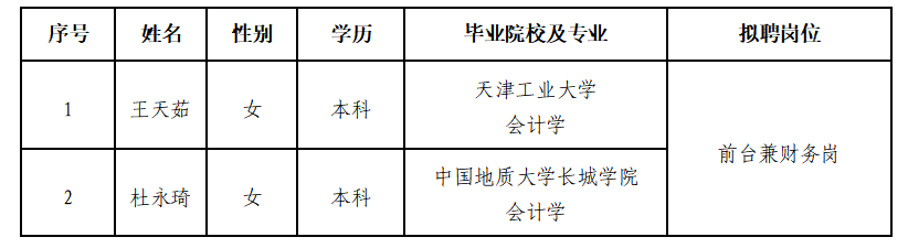 因公司發(fā)展需要,承德市建設(shè)投資有限責(zé)任公司委托第三方機(jī)構(gòu)面向社會(huì)公開招聘前臺兼財(cái)務(wù)崗員工?,F(xiàn)對擬錄用人員信息進(jìn)行公示,公示期間如有異議,可通過電話、信函等方式反映,反映意見請署真實(shí)姓名。